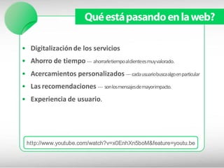 Este documento habla sobre las redes sociales y su importancia para el marketing de servicios jurídicos. Explica que los consumidores se basan en las recomendaciones de otros cuando toman decisiones y que el objetivo del marketing es lograr esas recomendaciones. También describe las principales redes sociales como LinkedIn, Twitter y Facebook, cómo funcionan, sus características y cómo pueden usarse profesionalmente para atraer clientes, posicionar una marca y medir resultados. Además, incluye ejemplos exitosos de cómo despachos jurídicos