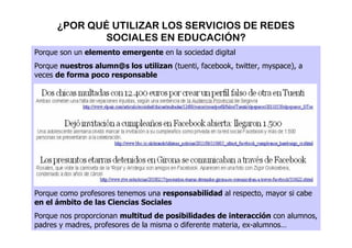 Este documento discute los beneficios y desafíos del uso de redes sociales en educación. Las redes sociales son una parte emergente de la sociedad digital y son utilizadas por estudiantes, por lo que los profesores deben considerar su uso responsable en el aula. Sin embargo, se debe ser cauto y conocer tanto las ventajas como los inconvenientes de cada red social para elegir la más adecuada.