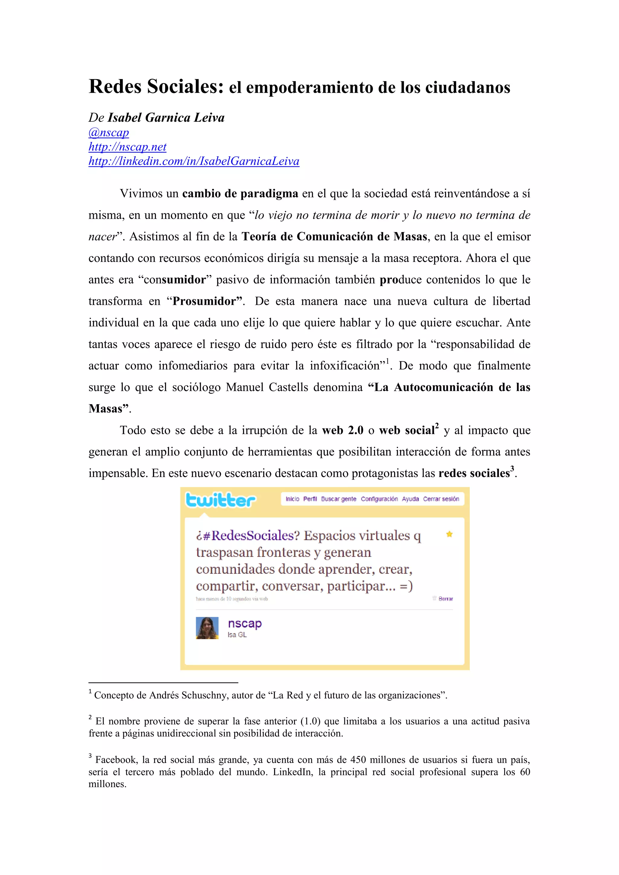 Este documento describe el empoderamiento de los ciudadanos a través del uso de las redes sociales. Explica cómo las redes sociales permiten a las personas conocerse, aprender, crear, compartir, conversar y colaborar sin limitaciones físicas. También permite nuevas formas de participación ciudadana y gobierno abierto a través de la transparencia y participación. Finalmente, destaca los desafíos de cerrar la brecha digital para que más personas puedan acceder a las redes sociales.