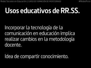 El documento describe los usos educativos de las redes sociales Facebook y Twitter. Se explica que Facebook puede utilizarse para compartir conocimiento, seguir a profesionales del sector, crear redes de docentes y grupos de asignaturas/cursos que sirvan como repositorios de material didáctico, agendas, resúmenes de clase y espacios de debate. En cuanto a Twitter, sus usos educativos incluyen compartir materiales, agenda de anuncios, resolver dudas, debatir, incorporar a terceros, difundir eventos, resumir
