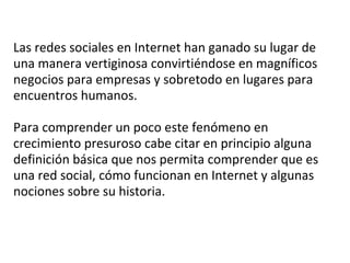 Las redes sociales en Internet han ganado popularidad rápidamente como negocios lucrativos y lugares para conexiones humanas. Las redes sociales permiten que personas interactúen online aunque no se conozcan, y cada nuevo miembro que se une transforma y construye la red. Sitios como Friendster, Myspace y Facebook se hicieron populares en los 2000s, atrayendo a millones de usuarios y publicidad. Sin embargo, a medida que las redes sociales se convirtieron en negocios, surgieron preocupaciones sobre la privacidad de los datos y el control corporativo.
