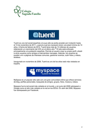 Las redes sociales son estructuras sociales compuestas de grupos de personas conectadas por relaciones como amistad o intereses comunes. Algunas redes sociales populares en Internet son Twitter, que permite enviar mensajes cortos de hasta 140 caracteres; Facebook, originalmente creado para estudiantes universitarios pero ahora abierto a todos; y Tuenti, una red social española para personas de 14 años o más que permite crear perfiles y conectarse con amigos.