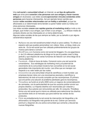 Las redes sociales en Internet son comunidades virtuales que permiten a las personas conectarse con amigos y hacer nuevos amigos compartiendo intereses comunes. Funcionan como plataformas para compartir fotos, videos y otros contenidos, y han crecido rápidamente gracias a su capacidad de crecimiento viral. Algunas de las redes sociales más populares incluyen Facebook, YouTube, Twitter e Instagram.