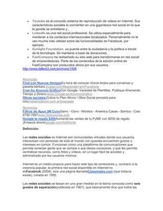 Youtube es elconocido sistema de reproducción de videos en Internet. Sus características sociales lo convierten en una gigantesca red social en la que la genete se entretiene y , LinkedIn es una red social profesional. Se utiliza especialmente para mantener a los contactos internacionales localizados. Personalmente no le veo mucha más utilidad sobre las funcionalidades de Facebook, por ejemplo. Sunlight Foundation, un puente entre la ciudadanía y la política a través de la tecnología. Se mantiene a base de donaciones. FastCompany ha rediseñado su sitio web para transformarse en red social de emprendedores. Parte de los contenidos de la edición online de FastCompany son producidos ahora por sus usuarios. http://www.tallerd3.com/archives/1506 Anuncios Chat con Nuevos AmigosEs hora de conocer chicos lindos para conversar y pasarla bárbaro.Duego.com/Registrate+en+Facebook Cree Su Anuncio GráficoCon Google. Variedad de Plantillas. Publique Ahorrando Tiempo y Dinero.www.Google.es/AnuncioGrafico Obras sociales¡Cotiza tu Plan Ahora ! Obra Social pensada para vosbristolmedicine.com.ar/prepagas Anuncios Filtros de Agua 3M CunoSarro - Cloro - Nitratos - Arsenico Casas - Barrios - Cías 4792-7897www.3soluciones.com Google te regala $200Aumentá las ventas de tu PyME con $200 de regalo. ¡Empezá ahora!google.com/AdWords Definición: Las redes sociales en Internet son comunidades virtuales donde sus usuarios interactúan con personas de todo el mundo con quienes encuentran gustos o intereses en común. Funcionan como una plataforma de comunicaciones que permite conectar gente que se conoce o que desea conocerse, y que les permite centralizar recursos, como fotos y vídeos, en un lugar fácil de acceder y administrado por los usuarios mismos. Internet es un medio propicio para hacer este tipo de conexiones y, contrario a la creencia popular, la primera red social disponible en Internet no esFacebook (2004), sino una página llamadaClassmates.com (que todavía existe), creada en 1995. Las redes sociales se basan en una gran medida en la teoría conocida como seis grados de separación(publicada en 1967), que básicamente dice que todos las