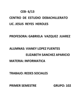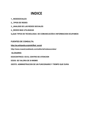 Este documento trata sobre las redes sociales. Describe los tipos de redes sociales como redes personales, temáticas y profesionales. También analiza las redes sociales más utilizadas como Facebook, Twitter y LinkedIn. Finalmente, explica las tecnologías de comunicación e información como Internet que hacen posible las redes sociales.