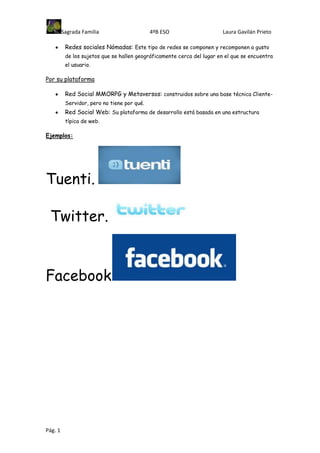 Este documento clasifica y explica los diferentes tipos de redes sociales. Las redes sociales se pueden clasificar por el perfil de usuario, público objetivo, sujeto principal de la relación, localización geográfica y plataforma. Algunos ejemplos de redes sociales mencionados son Tuenti, Twitter y Facebook.