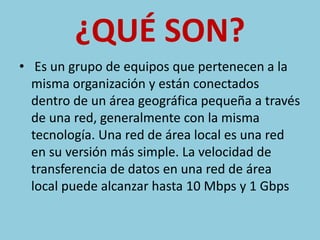 Una red de área local (LAN) conecta equipos dentro de un área geográfica pequeña a través de una red. Existen dos modos de operación de una LAN: punto a punto sin un equipo central o cliente-servidor con un equipo central brindando servicios. Las LAN se pueden clasificar en diferentes tipos dependiendo del área de cobertura como LAN, WAN, CAN, MAN y PAN.
