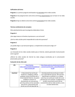 Este documento explora varias preguntas sobre las redes sociales, incluyendo si forman parte de la naturaleza humana, los requisitos para unirse a ellas, y si están reemplazando las redes tradicionales basadas en la comunicación personal. Explica brevemente qué son las redes sociales y cómo surgieron sitios populares como Facebook y MySpace. Finalmente, evalúa dos sitios web sobre redes sociales considerando su exactitud, autoría, objetividad, actualidad y cobertura.