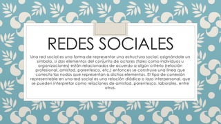 El documento habla sobre las redes sociales y su historia. Explica que una red social representa una estructura social mediante nodos y líneas que conectan elementos relacionados. Luego resume brevemente la historia de las redes sociales desde 1971 cuando se envió el primer correo electrónico hasta 1978 cuando surgieron los primeros BBS.