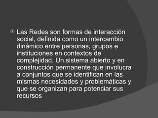 Las redes sociales son formas de interacción entre personas e instituciones que comparten intereses y necesidades. Estas redes se construyen dinámicamente a medida que nuevos miembros se unen y otros dejan de participar, transformando continuamente al grupo. Las redes sociales en Internet permiten conectar a personas que comparten preocupaciones aunque no se conozcan personalmente, rompiendo el aislamiento y posibilitando la integración de individuos diversos.