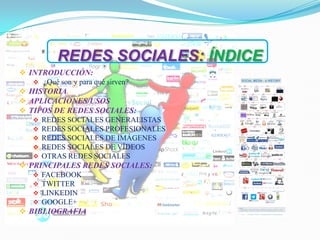 Este documento presenta una introducción a las redes sociales, incluyendo una breve historia, definiciones, tipos y usos. También describe las principales redes sociales como Facebook, Twitter, LinkedIn y Google+, detallando sus orígenes, funciones y estadísticas clave. El documento proporciona una visión general de alto nivel de las redes sociales más populares.