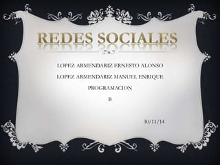 Este documento habla sobre las redes sociales. Define una red social como una estructura que conecta nodos que representan elementos relacionados. Describe las características principales de las redes sociales como facilitar la conexión entre personas y permitir la interacción e intercambio de información. Además, clasifica los diferentes tipos de redes sociales y discute algunos riesgos y regulaciones relacionadas con el uso de redes sociales.