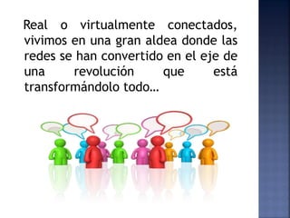El documento describe el surgimiento de la Web 2.0 y sus características principales. La Web 2.0 se centra en las personas y el contenido generado por los usuarios a través de comunidades, blogs, wikis y redes sociales. Esto representa un cambio cultural hacia la transparencia y la construcción colectiva del conocimiento. Las tecnologías de la Web 2.0 como Ajax y los servicios web han transformado la comunicación, los negocios y la sociedad al facilitar la interacción y el intercambio de información entre las personas.
