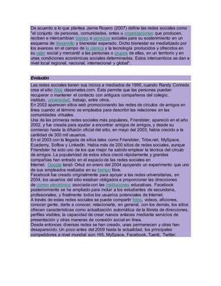 Las redes sociales son comunidades virtuales donde las personas interactúan con otras que comparten intereses. Funcionan como plataformas para comunicarse y compartir fotos y videos. Algunas de las primeras y más populares redes sociales fueron Classmates.com en 1995, Friendster en 2002, y Facebook, creado originalmente para universidades en 2004. Las redes sociales ahora se usan para comunicarse, hacer marketing, y entretenerse.