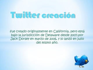 Twitter fue creado por Jack Dorsey en 2006 como un proyecto dentro de la empresa Obvious. Se lanzó como una red social para compartir mensajes cortos ("tweets") de hasta 140 caracteres. En sus inicios se llamó "twttr" y estaba escrito en Ruby on Rails. Actualmente es una de las redes sociales más populares y se usa para comentar eventos en directo, compartir opiniones y crear pequeñas comunidades entre usuarios.