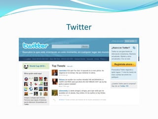 Este documento describe Twitter como un servicio de microblogging que permite a los usuarios publicar mensajes cortos ("tweets") de 140 caracteres y seguir los tweets de otros. Explica cómo los medios de comunicación usan Twitter para transmitir noticias de forma inmediata y atraer audiencias. También proporciona ejemplos de periodistas y deportistas famosos que usan Twitter y describe brevemente cómo funcionan las herramientas de Twitter.