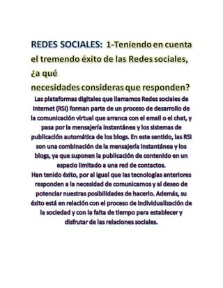 Este documento discute los posibles efectos positivos y negativos de las redes sociales en la vida social de una persona. Mientras que algunos estudios sugieren que las redes sociales pueden mejorar la sociabilidad de una persona, también existe el riesgo de que las relaciones se vuelvan más superficiales y pierdan intimidad. El documento también identifica varios riesgos potenciales de las redes sociales, como el aislamiento social, la obsesión, el voyerismo y la acumulación excesiva de amigos. Finalmente, sugiere que para evitar estos