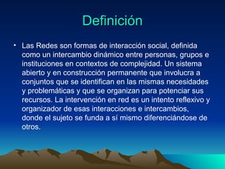 Las redes sociales son formas de interacción social definidas como intercambios dinámicos entre personas, grupos e instituciones. En internet, los individuos se conectan a través de perfiles y la creación de enlaces. Existen redes sociales analógicas y digitales. Las redes sociales digitales como Facebook, YouTube y Flickr permiten actualizar contactos, crear perfiles y conexiones sociales en línea. En América Latina, Brasil tiene la mayor participación en redes sociales, mientras que las redes han crecido rápidamente, conectando a