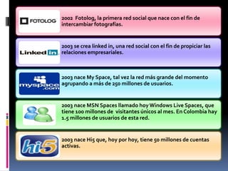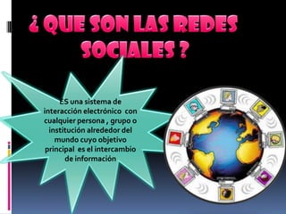Las redes sociales son sistemas electrónicos de interacción global que permiten el intercambio de información entre personas, grupos e instituciones. Su origen se remonta a la Web 2.0, que facilitó aplicaciones para compartir contenidos e información de interés, expresar opiniones y crear conocimiento colectivo. Las redes sociales brindan una plataforma para buscar y recibir datos de otros usuarios de manera interactiva.