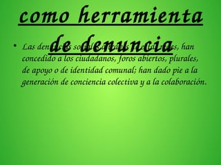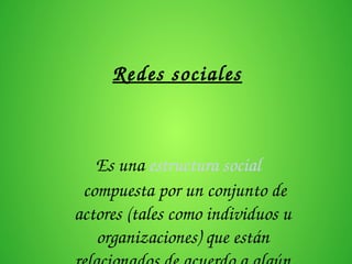 Este documento describe las redes sociales como estructuras sociales compuestas por individuos u organizaciones conectados entre sí. Explica que las redes sociales han permitido denuncias ciudadanas y conciencia colectiva. También señala riesgos como la pérdida de privacidad y acceso a contenidos inadecuados. Finalmente, enumera algunas de las redes sociales más populares y cómo satisfacen la necesidad humana de relacionarse al suplir el aislamiento social moderno.