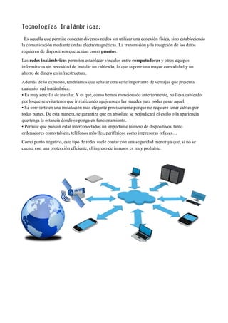 Las redes sociales son sitios de Internet formados por comunidades de individuos con intereses en común que permiten comunicación e intercambio de información. Facebook y Twitter son dos de las redes sociales más populares, con más de 1000 millones y cientos de millones de usuarios respectivamente. Las redes inalámbricas permiten conectar dispositivos sin cables de manera más sencilla y elegante que las redes cableadas.