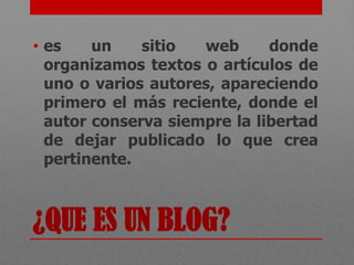 El documento habla sobre las redes sociales y blogs. Explica que un blog es un sitio web donde se organizan textos o artículos de uno o más autores, apareciendo primero el más reciente. Los blogs generan intercambio de experiencias y nuevas formas de aprendizaje, permitiendo a los usuarios expresarse y comunicarse. Finalmente, proporciona ejemplos de populares proveedores de blogs.