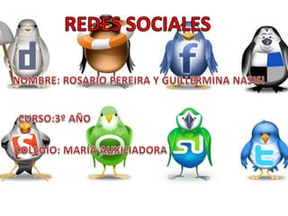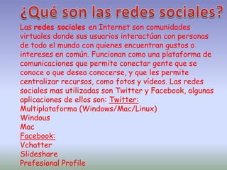 Las redes sociales son comunidades virtuales donde los usuarios interactúan con personas de todo el mundo con intereses en común. Funcionan como plataformas de comunicación que permiten conectar a la gente y compartir recursos como fotos y videos. Las redes sociales más utilizadas son Twitter y Facebook. El origen de las redes sociales se remonta a 1995 y en la actualidad se han convertido en una forma innovadora de relacionarse aunque aún se usan poco con fines académicos.