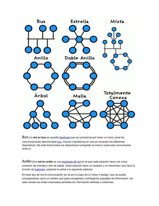 Este documento describe diferentes tipos de topologías de red, incluyendo bus, anillo, estrella, árbol, malla y totalmente conectada. Define cada una y explica sus características principales, como que un bus tiene un único canal de comunicación compartido, un anillo pasa tokens de un nodo al siguiente, una estrella tiene todos los nodos conectados a un punto central, y una malla conecta cada nodo con todos los demás.