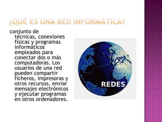 El documento describe las características básicas de una red informática. Explica que una red conecta dos o más computadoras permitiendo compartir recursos como archivos e impresoras. Se compone de componentes físicos como cables y adaptadores de red, así como de programas que establecen protocolos para la comunicación entre las máquinas. Finalmente, señala algunas de las topologías más comunes como punto a punto, bus, estrella y anillo.