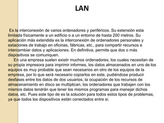 El documento habla sobre redes y cableado estructurado. Explica que una LAN permite la interconexión de ordenadores y periféricos dentro de un edificio o entorno físico para compartir recursos. También describe diferentes tipologías de redes como bus, anillo y estrella, así como estándares de cableado UTP/STP como Cat3, Cat5e y Cat6. Finalmente, detalla los componentes de un cableado estructurado como el cableado horizontal, vertical y los armarios de distribución.