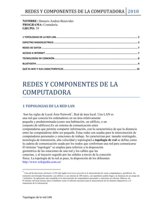 El documento describe diferentes tipos de tecnologías de comunicación como redes, componentes de computadoras, topologías de redes LAN, espectro radioeléctrico, redes de datos, acceso a Internet, tecnologías de conexión como Bluetooth y WiFi. Explica conceptos clave sobre cómo funcionan las redes de computadoras a nivel local y global.