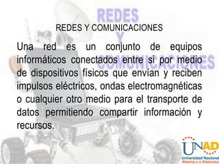 Una red es un conjunto de equipos informáticos conectados que comparten información y recursos. Existen diferentes tipos de redes como las redes de área personal, local, de campus, metropolitana y amplia. Las redes requieren hardware como servidores, tarjetas de red, concentradores y software como sistemas operativos, servidores de aplicaciones y correo. Las redes se pueden conectar mediante cables, fibra óptica o de forma inalámbrica y su topología puede ser en bus, estrella, mixta, anillo o malla