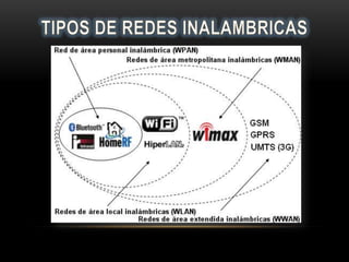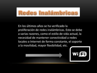 Las redes inalámbricas se han vuelto más populares en los últimos años debido al estilo de vida moderno y la necesidad constante de conectividad. Este documento describe la historia y los tipos principales de redes inalámbricas, incluidas las redes de área personal, metropolitanas, locales y extensas. Explica cómo funcionan y las tecnologías clave como Wi-Fi, Bluetooth y protocolos celulares.