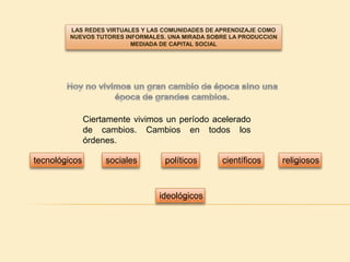 Este documento discute cómo las redes virtuales y las comunidades de aprendizaje están transformando la educación al permitir nuevas formas de aprendizaje informal y producción de capital social. También analiza cómo la educación a distancia a través de Internet ha abierto las puertas a una educación global que ya no está limitada por el tiempo o el espacio físico. El documento concluye explicando cómo los paradigmas de enseñanza y aprendizaje han evolucionado hacia modelos centrados en el aprendizaje del estudiante.