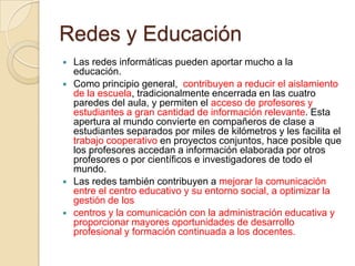 Las redes informáticas pueden contribuir mucho a la educación al reducir el aislamiento de las escuelas y facilitar el acceso a información y la colaboración entre estudiantes y profesores separados por grandes distancias. Las redes también mejoran la comunicación entre las escuelas y su entorno social y proporcionan mayores oportunidades de desarrollo profesional para los docentes.