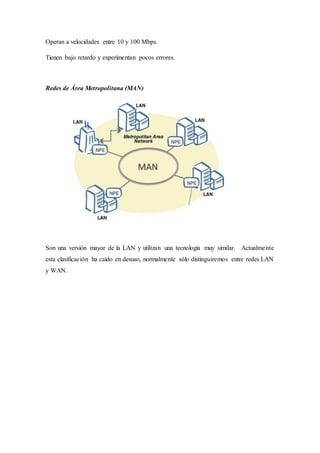 Este documento describe tres tipos principales de redes de computadoras: redes de área local (LAN), redes de área metropolitana (MAN) y redes de área amplia (WAN). Las LAN son redes privadas de hasta unos pocos kilómetros que conectan computadoras dentro de una oficina o escuela. Las MAN son versiones más grandes de las LAN. Las WAN se extienden a través de áreas geográficas más grandes usando líneas de comunicación y enrutadores.