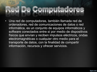 Una red de computadoras conecta equipos informáticos para compartir información y recursos. Existen diferentes tipos de redes clasificadas por su tamaño, como redes personales, de área local en oficinas o edificios, y de área más amplia en universidades. Las redes requieren hardware, software y protocolos para interconectar computadoras, servidores y otros dispositivos a través de cableado o tecnología inalámbrica. Modelos como OSI y TCP/IP definen el funcionamiento de las redes a través de capas de protocolos.