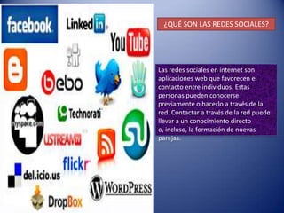 Las redes sociales son aplicaciones web que permiten a las personas conectarse e interactuar entre sí. Existen varios tipos de redes sociales, incluidas las redes sociales generales más populares como Facebook y Twitter, las redes profesionales como LinkedIn que conectan a colegas, y las redes verticales que unen a personas con intereses similares. Las redes sociales pueden conducir al conocimiento directo de nuevas personas e incluso la formación de parejas.