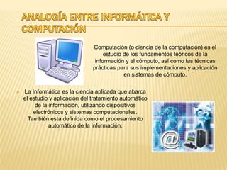 El documento compara la informática y la computación. Explica que la computación es el estudio teórico de la información y el cómputo, mientras que la informática es la aplicación práctica del procesamiento automático de la información usando sistemas computacionales. Además, señala que la informática surge a partir de la convergencia de diversas disciplinas como la computación, programación, redes y inteligencia artificial. Finalmente, indica que sin la computación no existiría la informática ya que esta última se basa en los fundamentos de aquella