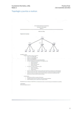 El documento detalla la práctica final de un curso de redes en la Universidad Autónoma de Querétaro, donde se configura un entorno de red utilizando switches y servidores. Se configura un dominio VTP con un servidor y dos clientes, se establecen las VLANs correspondientes, y se gestionan las conexiones entre dispositivos asegurando la seguridad y funcionalidad de la red. Finalmente, se comprueba el funcionamiento adecuado de los servicios web y FTP en sus respectivas VLANs.