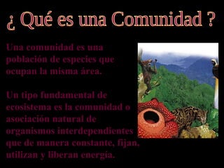 Un ecosistema está compuesto de una comunidad de organismos en interacción con su medio ambiente físico. Dentro de un ecosistema, las especies forman cadenas y redes alimentarias complejas a través de las cuales fluye la energía proveniente originalmente del sol. Los productores, como las plantas, capturan la energía solar inicialmente, mientras que los consumidores y descomponedores reciclan la materia y energía a lo largo de la red trófica.