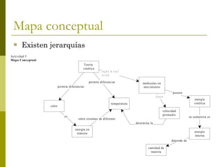 El documento describe los mapas conceptuales y las redes conceptuales como herramientas para organizar la información. Explica que los mapas conceptuales muestran jerarquías de conceptos pero que estas jerarquías pueden variar, mientras que las redes conceptuales usan oraciones nucleares entre conceptos para mostrar las relaciones entre ellos sin imponer una jerarquía rígida. También proporciona requisitos para construir redes conceptuales efectivas como usar verbos precisos entre conceptos y no repetir nodos.