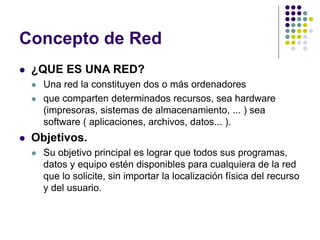 El documento describe conceptos básicos sobre redes de computadoras. Brevemente explica que una red conecta dos o más ordenadores para compartir recursos hardware y software. Luego detalla objetivos como proporcionar alta disponibilidad y comunicación entre usuarios distantes. Finalmente, resume brevemente la historia y evolución de las redes desde las primeras computadoras hasta las redes inalámbricas modernas.