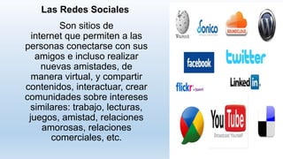 Este documento trata sobre las redes sociales. Explica que las redes sociales se originaron en 1995 para mantener contacto con antiguos compañeros. Luego en 2002 surgieron sitios para conectar a amigos en línea. Describe cómo funcionan las redes sociales, los tipos principales como Facebook, Twitter y MySpace, y analiza tanto las ventajas como las desventajas de su uso. Finalmente, destaca la importancia de las redes sociales en la educación y la sociedad del conocimiento al facilitar nuevas formas de comunicación y aprendizaje.