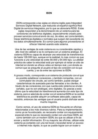 El documento describe dos tipos de conexión a Internet: conexión por línea conmutada y conexión ISDN. La conexión por línea conmutada es más barata pero más lenta, mientras que la conexión ISDN es más rápida pero requiere infraestructura digital. ISDN proporciona conexiones digitales de hasta 128 kbps utilizando múltiples canales simultáneos.