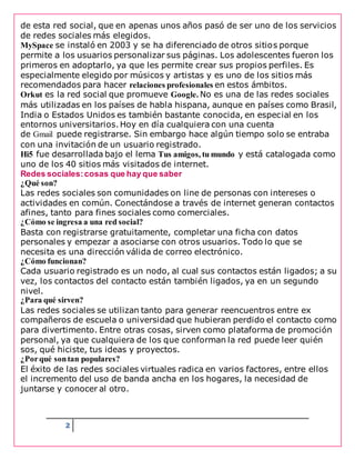 Las redes sociales en internet comenzaron en 1995 y han crecido exponencialmente, permitiendo que las personas se conecten con amigos y hagan nuevas amistades virtualmente. Las redes sociales más populares son Facebook, que atrae a cientos de millones de usuarios; Twitter, que permite compartir actualizaciones breves; y MySpace, que permite a los usuarios personalizar sus perfiles. Las redes sociales continúan atrayendo a más personas, especialmente adolescentes y adultos jóvenes, debido a su capacidad para mantenerse en contacto con otros y promoverse a