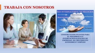 Este documento presenta una red internacional de negocios que busca promover el desarrollo económico a través de alianzas estratégicas y el networking empresarial. La red convoca a jóvenes emprendedores y creativos a unirse mediante el uso de redes sociales para generar contactos internacionales y proyectos colaborativos, contribuyendo así a la economía creativa impulsada por el BID.