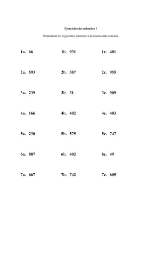 El documento explica cómo redondear números a la decena o centena más cercana. Indica que para redondear a la decena, los números que terminan entre 1-4 se redondean al número menor anterior terminado en cero, y los números que terminan en 5 o más se redondean a la próxima decena. Para redondear a la centena, sigue la misma lógica pero con los cientos en lugar de las decenas. Luego proporciona ejercicios de práctica para redondear números a la decena y centena más cercana.