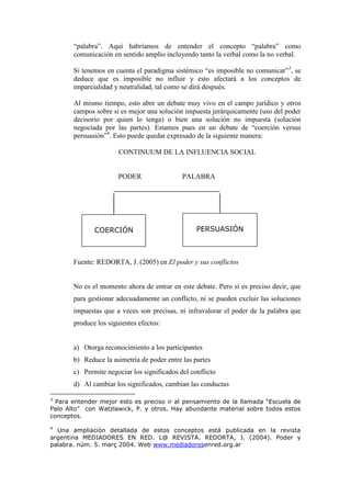 Este documento presenta una primera aproximación al concepto operativo de la mediación. Explica que aunque el mediador no tiene poder decisorio sobre la solución, siempre tendrá algún grado de influencia social sobre las partes. También distingue entre la imparcialidad del mediador hacia las partes y su neutralidad respecto al objeto del conflicto. Finalmente, señala que la reconstrucción de la confianza entre las partes a través de la voluntariedad, confidencialidad y proactividad son fundamentales para la mediación.