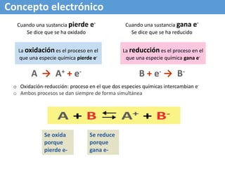 El documento describe conceptos tradicionales y electrónicos de las reacciones de oxidación-reducción. Tradicionalmente, se referían a la combinación con oxígeno, pero el concepto electrónico se refiere al intercambio de electrones, donde la oxidación implica la pérdida de electrones y la reducción la ganancia de electrones. Las reacciones redox siempre involucran la oxidación simultánea y reducción de especies químicas a través del intercambio de electrones.